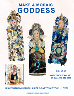 These mosaic Goddess totems are so fun! Using a vibrant assortment of cut porcelain and ceramics, you will create your 9 inch mosaic and watch all of the colors and patterns and shapes come together. You can select from a variety of adornments and choose a special headdress. If you have a favorite plate that has cracked or an heirloom not being used, you can bring it to incorporate into your artwork. These mosaics make a wonderful gift for someone else or yourself! Being creative is a great way to express self-love.